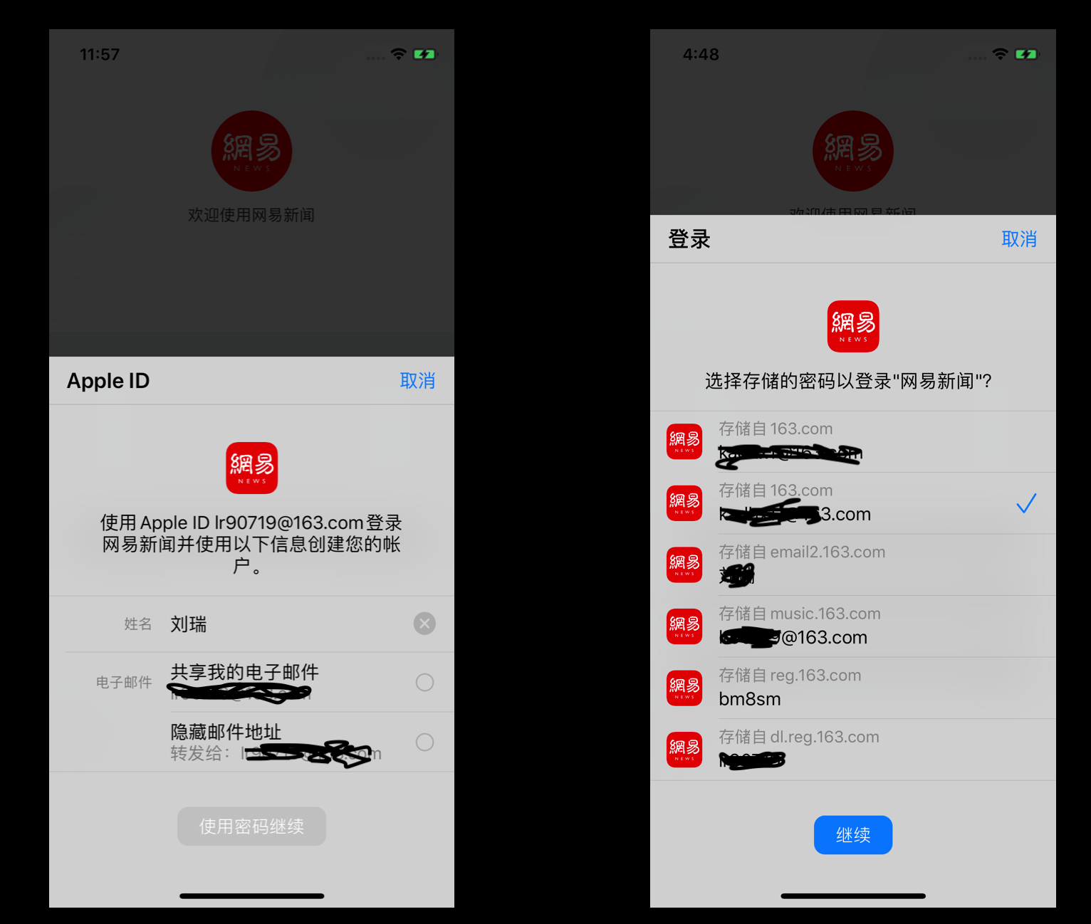 上面的代码同样提到了另一个Provider,ASAuthorizationPasswordProvider,这个则是说当我们的App之前用户已经登录过,并且在Keychain中已经存储了用户名密码的话,弹出的登录页面会有所不同,下图左边是没有发送passwordrequest的认证页面,右边是发送了passwordrequest的认证页面