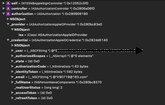 } else if ([authorization.provider isKindOfClass:[ASAuthorizationAppleIDProvider class]]) { //此时为使用Sign With Apple 方式登录 //继续进行客户端后台登录验证 }核心的返回参数解析:
